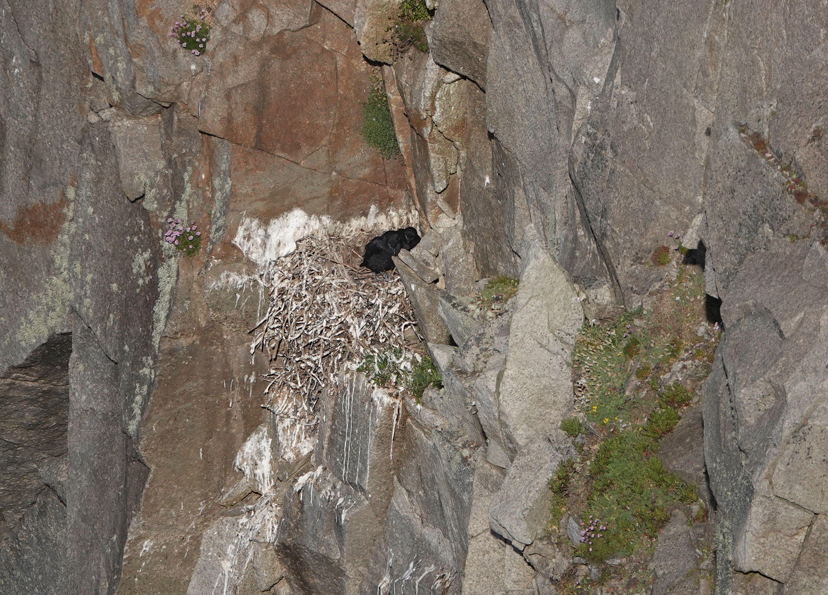 Earlier, we had been having a hugely enjoyable time walking the regular census route which begins and ends at the Tavern door. Millcombe features early in the circuit and is always a high point for us. On this occasion we were lucky enough to add Blue Tit to the record, a single bird that had arrived on Lundy two days previously; once an almost annual bird on the island, particularly in autumn, Blue Tits now seem to be increasingly uncommon. Other highlights were a Spotted Flycatcher, one of the first for the year, in Millcombe and three newly fledged Ravens with their parents along the South End, and two other young Ravens in a nest along the West Side. On the downside, it was very evident that Swallows migrating through Lundy were having a hard time feeding in the constant strong and chilly easterly wind, birds sitting on bramble bushes and even on short grass. The census route took us along the South End as far Rocket Pole Pond, across South West Field up to Old Light and over Ackland’s Moor to Quarter Wall, the outer limit of the recording area. Normally, a cursory look down into Quarter Wall Copse reveals a few birds, but holding binoculars steady in the very strong wind proved impossible and as for hearing song or calls, forget it!